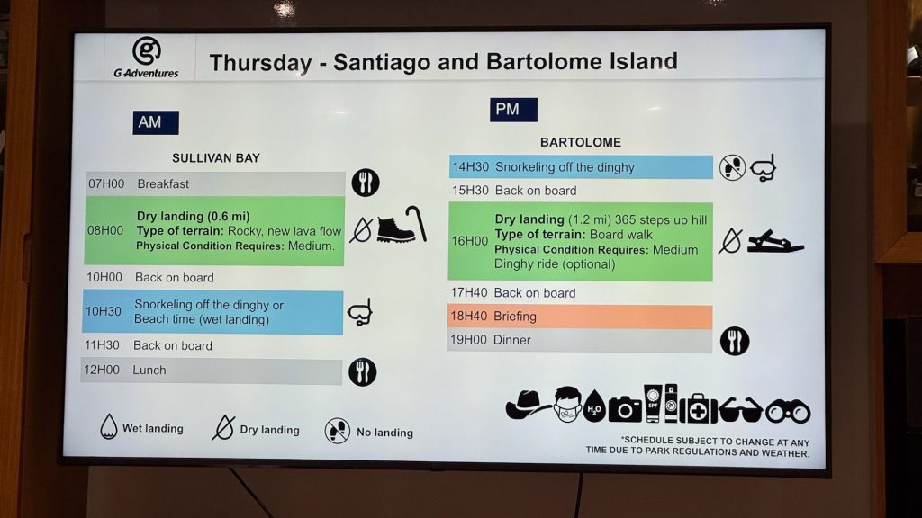 The trip to the Galapagos began early the following morning with the airport transfers organised by GAdventures. They had also arranged for our Galapagos Transit Control Card (USD20 each and paid in cash to the company). Upon arrival in Baltra there is also a fee of USD200 per person for entry to the islands and again we paid this in cash – we’d seen some reports that cards might be accepted but that the card readers only worked intermittently and we didn’t want to risk not being able to get in!